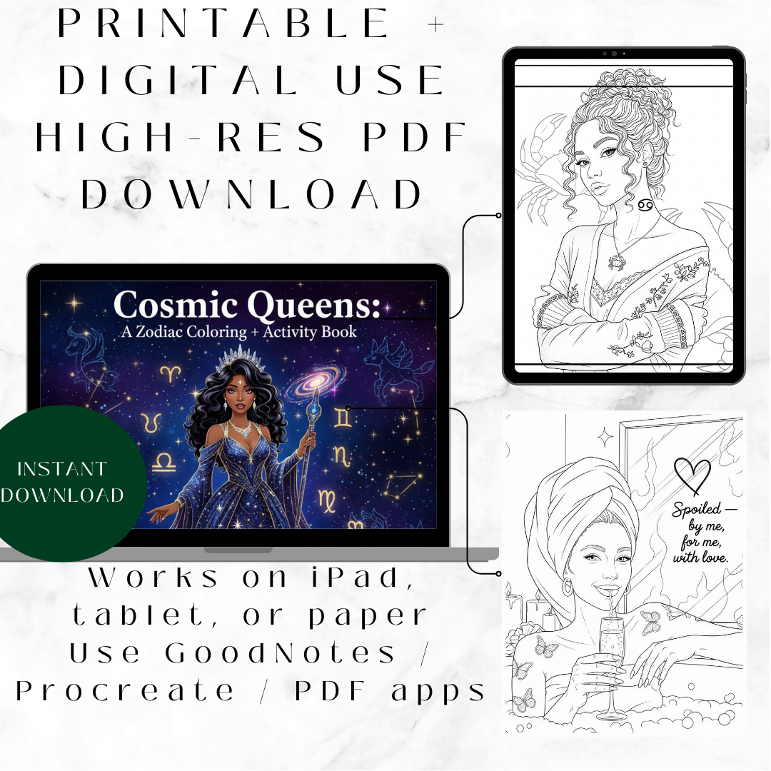 Cosmic Queens is a zodiac-inspired self-love coloring and activity book created for women who want a creative reset with intention. It blends affirmations and light activities with calming pages you’ll actually want to complete — grounded, empowering, and re-readable.